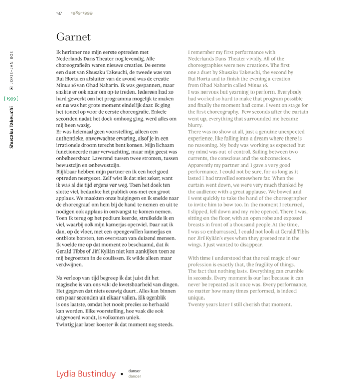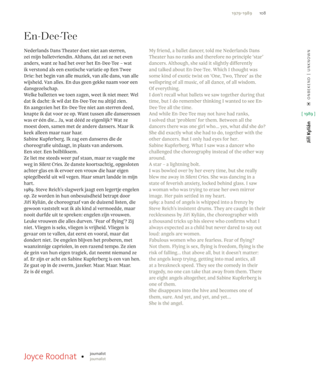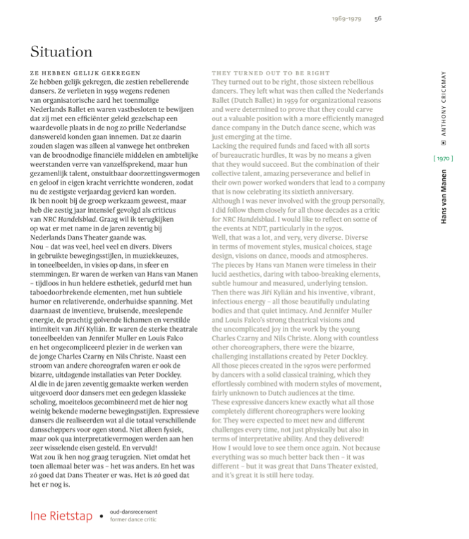 Bekende personen als Jirí Kylián, Sol León & Paul Lightfoot en Hans van Manen, (oud-)dansers, toneelmeesters en musici komen aan het woord. De persoonlijke reflecties worden daarnaast begeleid door teksten over de geschiedenis van het gezelschap en archiefmaterialen. Hiermee biedt deze publicatie een bijzondere inkijk in het erfgoed van een van de meest toonaangevende moderne dansgezelschappen ter wereld