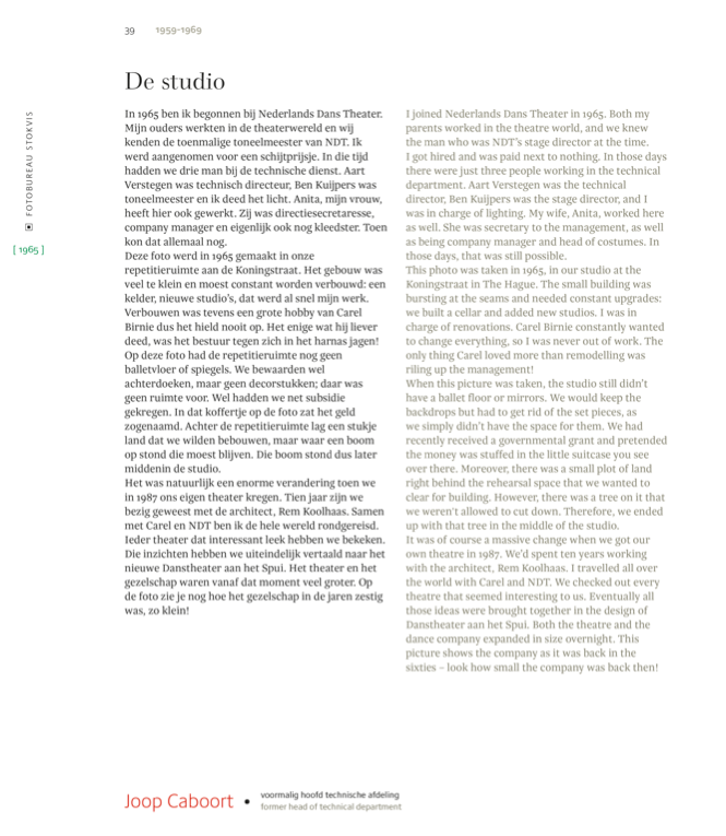 Nederlands Dans Theater (NDT) celebrates its sixtieth anniversary in this exclusive publication. Sixty images, by different photographers like Ed van der Elsken, Maria Austria, Erwin Olaf and Rahi Rezvani, tell the history of the company. Each picture comes with a short story, told by people who are (or were) very important to NDT: people like Jirí Kylián, Sol León & Paul Lightfoot and Hans van Manen, and former dancers, technicians, musicians, etc.